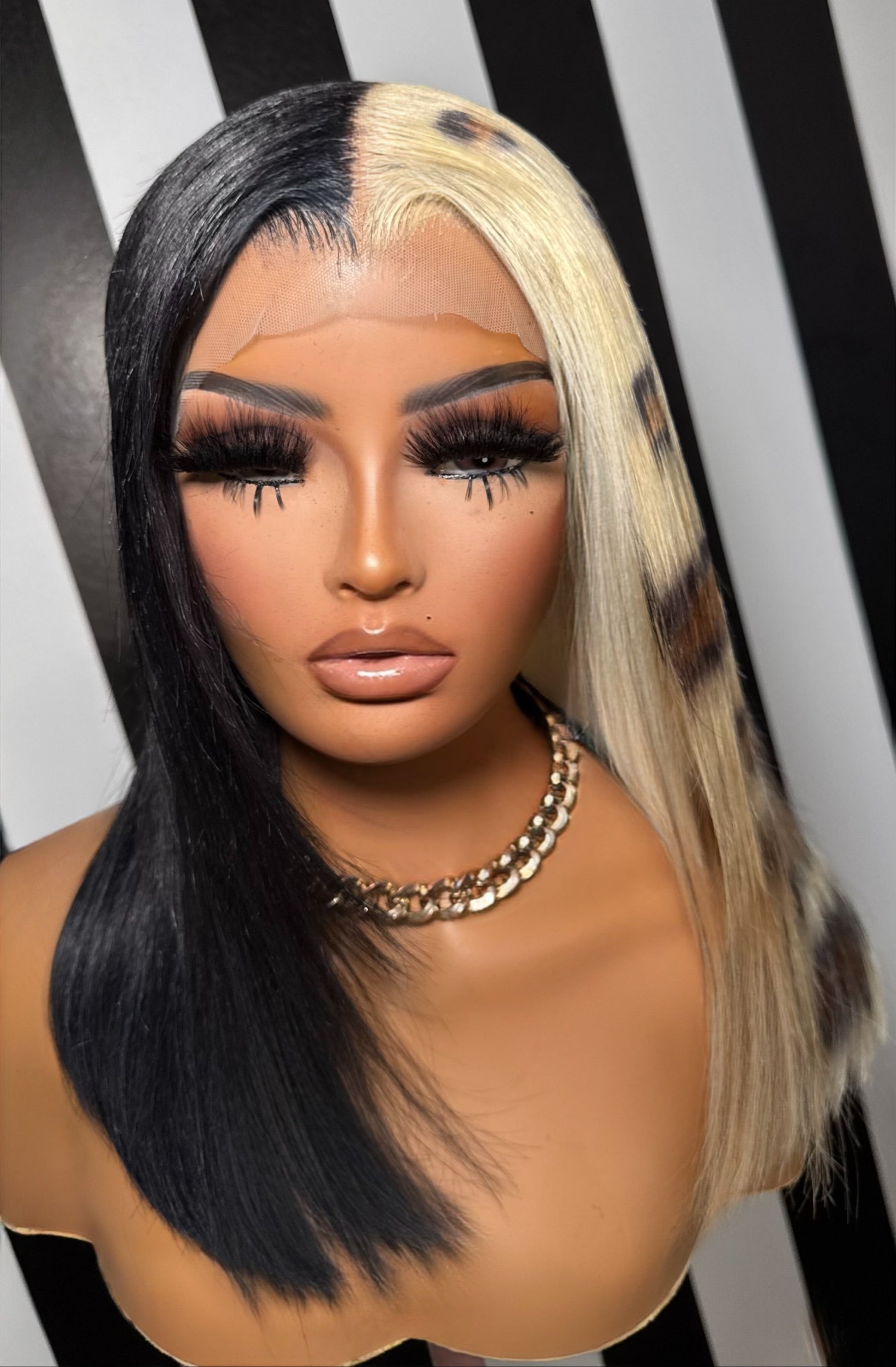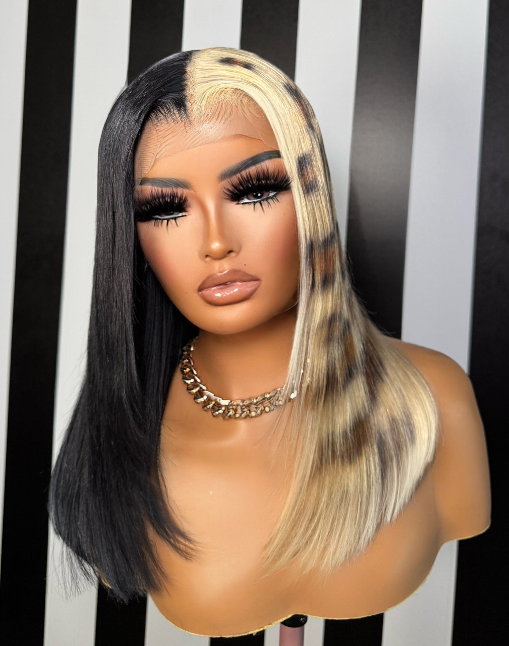 bold, and lightweight. Cut down from 26” to a chic 16–18” length, this split-dye unit blends cheetah print with black for a standout look. Pre-bleached and pre-plucked for easy installs.